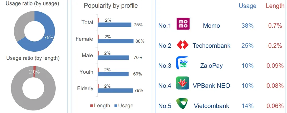 Báo cáo của Q&Me còn ghi nhận 75% người dùng điện thoại thông minh sử dụng ứng dụng thanh toán di động hoặc ứng dụng ngân hàng trực tuyến. Điều này cho thấy trong vài năm gần đây, thói quen quản lý tài chính và thanh toán của người Việt đã thay đổi đáng kể. Hầu hết người Việt chuộng xu hướng thanh toán không tiền mặt và các giải pháp đầu tư - tích lũy trên các ứng dụng di động.