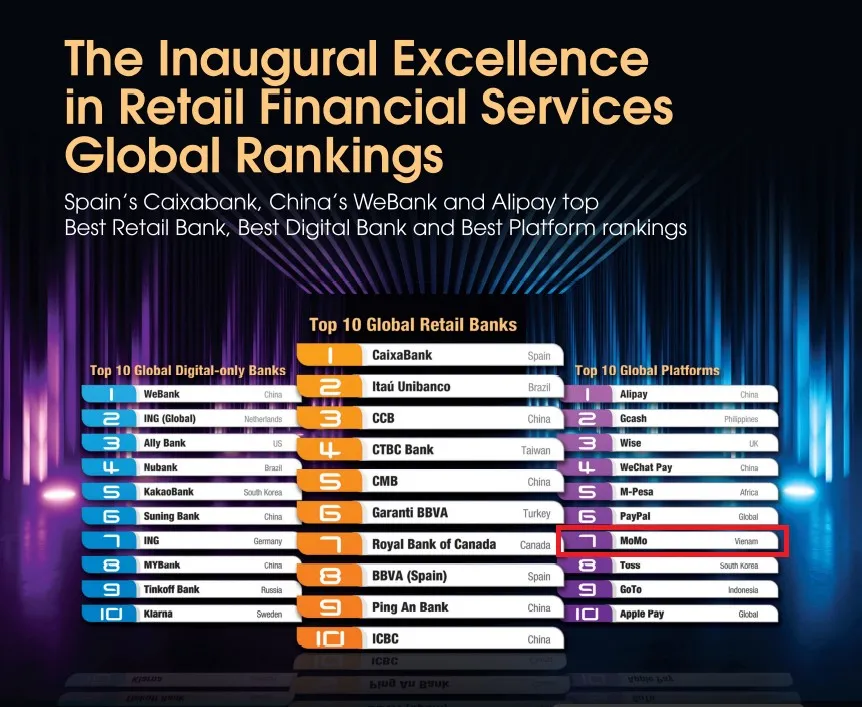 Với sự phát triển ngày càng mạnh của các nền tảng công nghệ tài chính, BXH Nền tảng dịch vụ tài chính toàn cầu 2023 đã đánh giá 20 nền tảng công nghệ hàng đầu trên thế giới, xếp hạng theo 6 tiêu chí bao gồm: Khách hàng; độ phủ và phạm vi dịch vụ; mức độ sử dụng và tính gắn kết; hiệu quả về mặt tài chính; hệ sinh thái; chiến lược và khả năng lãnh đạo. Trong bảng xếp hạng năm nay, MoMo đứng ở vị trí thứ 7 trong nhóm 10 cái tên dẫn đầu, đứng cạnh những tên tuổi lớn trên thế giới như Alipay, GCash, M-Pesa, Apple Pay, Paypal...