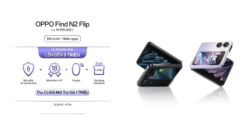 OPPO Find N2 Flip chính thức được mở bán từ ngày 8-4-2023 tại tất cả các hệ thống bán lẻ trên toàn quốc. Là “tân binh” của OPPO gia nhập vào thị trường smartphone màn hình gập, với những nâng cấp công nghệ tốt nhất, Find N2 Flip có giá bán lẻ chính thức là 19.990.000 đồng với hai phiên bản màu sắc thời trang: Tím Sương, Đen Khói… và thực tế khi nhận máy giá sẽ thấp hơn vì đi kèm là những bộ quà tặng “khủng”.