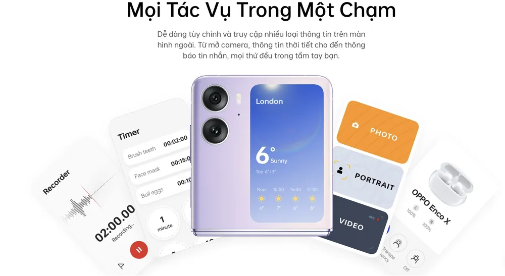 Điều thú vị của chiếc smartphone OPPO Find N2 Flip chính là các tác vụ ở “gương thần”, đây là chiếc điện thoại gập với công nghệ màn hình ngoài lớn nhất. Qua đó dễ dàng tùy chỉnh và truy cập nhiều loại thông tin trên màn hình ngoài. Từ mở camera, thông tin thời tiết cho đến thông báo tin nhắn, mọi thứ đều trong tầm tay người dùng….