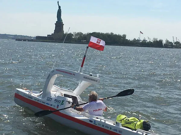 Aleksander Doba cùng chiếc kayak khởi hành tại TP New York ngày 29-5-2016. Ảnh: Facebook Aleksander Doba