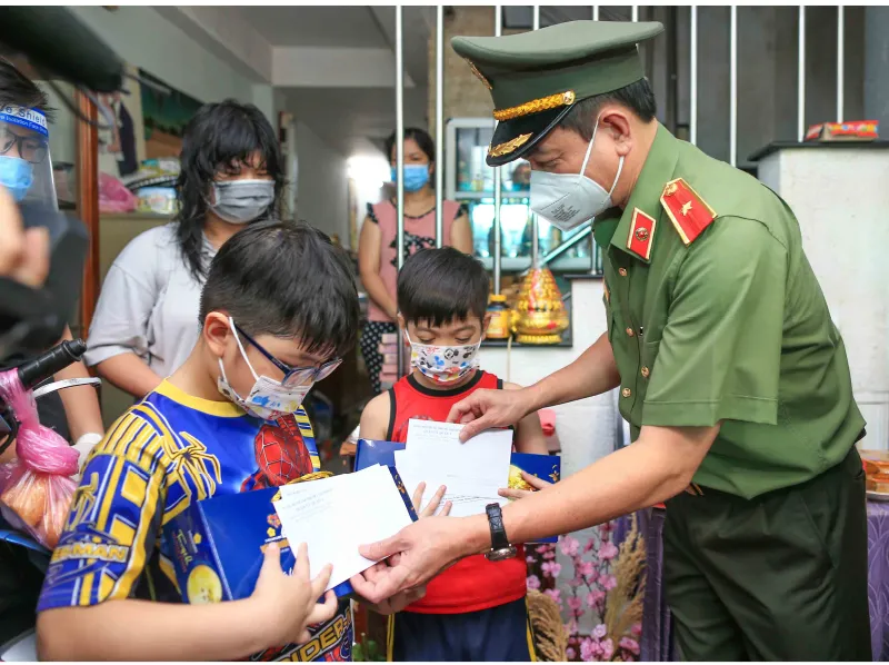 Chiều ngày 20-9, Đoàn Công tác Công an TPHCM do Thiếu tướng Lê Hồng Nam, Giám đốc Công an TPHCM dẫn đầu, đã tới thăm hỏi, động viên, tặng quà Trung thu cho các cháu thiếu nhi có cha, mẹ tử vong do mắc Covid-19 trên địa bàn quận 3.