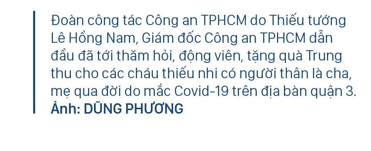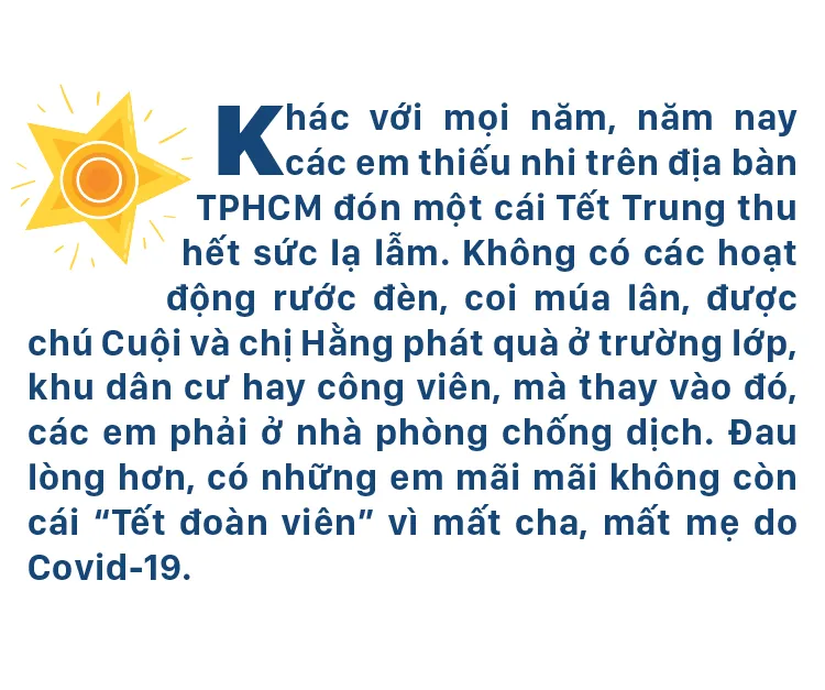 Khác với mọi năm, năm nay các em thiếu nhi trên địa bàn TPHCM đón một cái Tết Trung thu hết sức lạ lẫm. Không có các hoạt động rước đèn, coi múa lân, được chú Cuội và chị Hằng phát quà ở trường lớp, khu dân cư hay công viên, mà thay vào đó, các em phải ở nhà phòng chống dịch. Đau lòng hơn, có những em mãi mãi không còn cái “Tết đoàn viên” vì mất cha, mất mẹ do Covid-19.