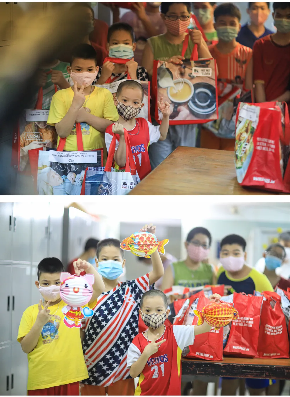 Mái ấm này nuôi dưỡng nhiều bé nam và cả những thanh thiếu niên. Đoàn ân cần thăm hỏi các cháu, trao các phần quà gồm bánh trung thu, tập vở, sữa, lồng đèn.
