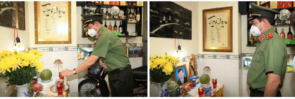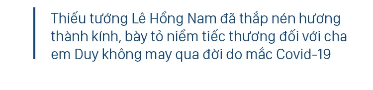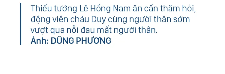 Tại đây, Thiếu tướng Lê Hồng Nam đã thắp nén hương thành kính, bày tỏ niềm tiếc thương đối với cha em Duy. Giám đốc Công an TPHCM cũng gửi lời động viên, chia sẻ với em Duy và mong em cố gắng phấn đấu để đạt được nhiều thành tích tốt trong học tập, không phụ lòng tình thương yêu, chăm sóc của gia đình, mọi người.