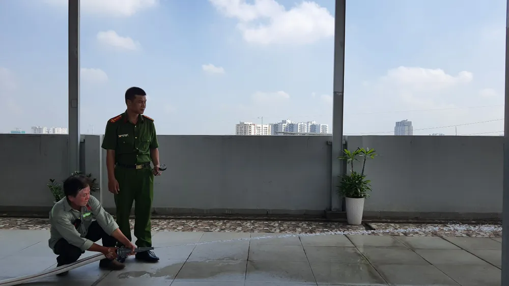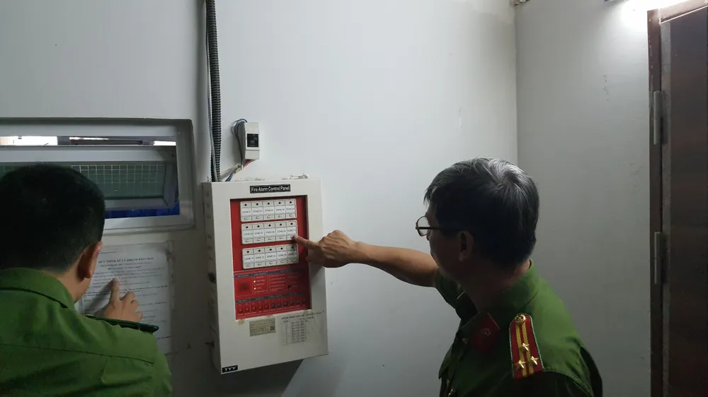 Tại đây, lực lượng chức năng đi từng tầng để kiểm tra hệ thống chuông báo cháy và tất cả đều hoạt động khi phát hiện khói, nhiệt. Nhân viên xây dựng và điện lực cũng kiểm tra giấy phép xây dựng và hệ thống an toàn điện ở tất cả các tầng.