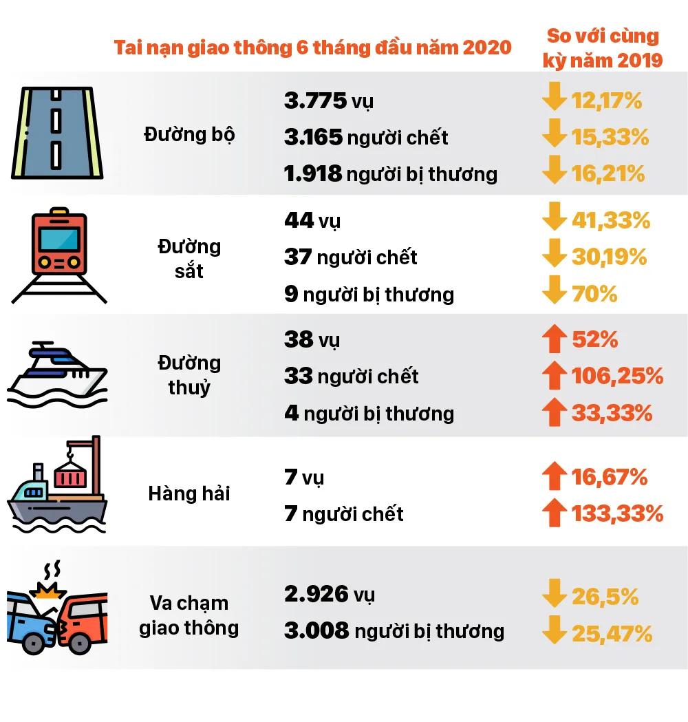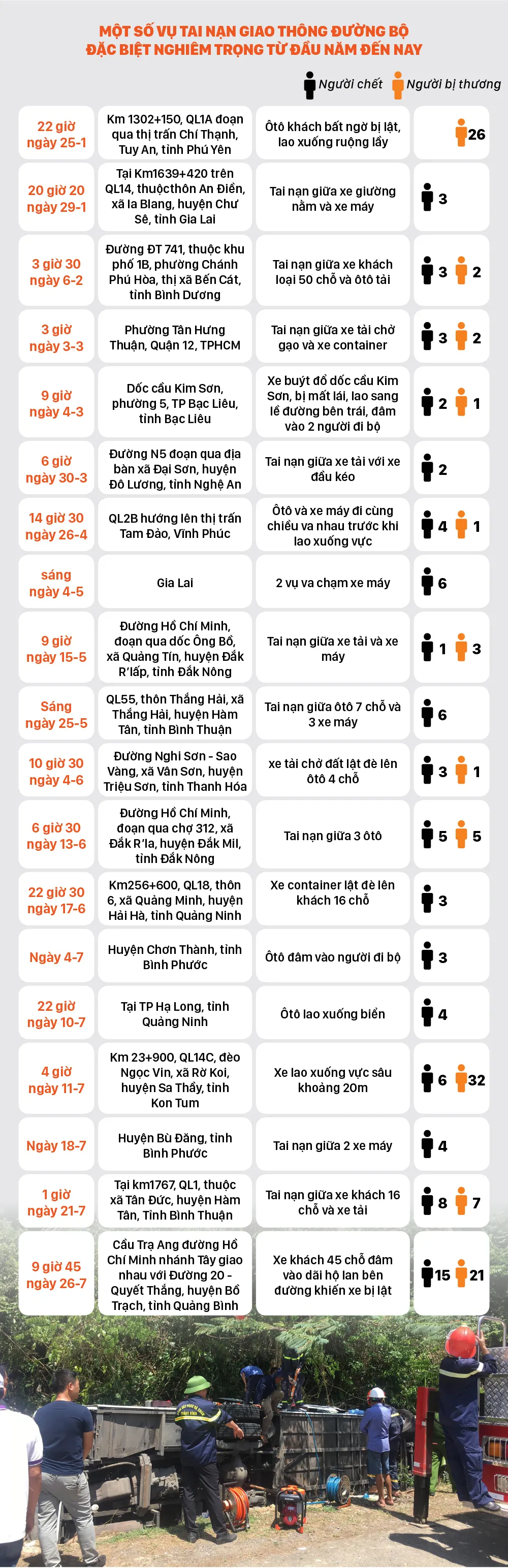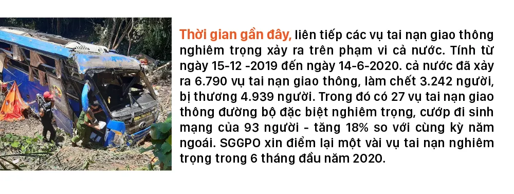 Thời gian gần đây, liên tiếp các vụ tai nạn giao thông nghiêm trọng xảy ra trên phạm vi cả nước. Tính từ ngày 15-12 -2019 đến ngày 14-6-2020. cả nước đã xảy ra 6.790 vụ tai nạn giao thông, làm chết 3.242 người, bị thương 4.939 người. Trong đó có 27 vụ tai nạn giao thông đường bộ đặc biệt nghiêm trọng, cướp đi sinh mạng của 93 người - tăng 18% so với cùng kỳ năm ngoái. SGGPO xin điểm lại một vài vụ tai nạn nghiêm trọng trong 6 tháng đầu năm 2020.