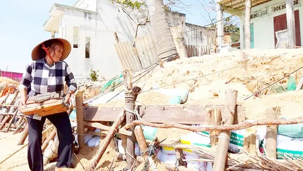 Trưa một ngày đầu tháng ba, bà con thôn ven biển Tiến Đức (xã Tiến Thành, TP Phan Thiết, tỉnh Bình Thuận) thay vì đã ra khơi đánh bắt hải sản như thường lệ, thì hàng chục người đủ lứa tuổi ai nấy đều lấm lem gắng sức tìm mọi cách mong níu lại những căn nhà, bức tường còn sót lại sau đợt biển “nuốt” nhà vừa mới xảy ra. Dưới cái nắng chói chang, bà Ngô Thị Hậu (70 tuổi) gồng mình bê những khối bê tông, đem về chặn những con sóng dữ đang ập vào những gì còn lại của căn nhà xiêu vẹo. Chỉ tay vào những vết nứt trên tường nhà, bà Hậu chia sẻ: “Những căn nhà bên cạnh đã sập hết rồi. Nhà tôi chắc chỉ một cơn sóng lớn nữa là cũng trôi ra biển luôn. Rồi không biết làm gì, ở đâu…”.