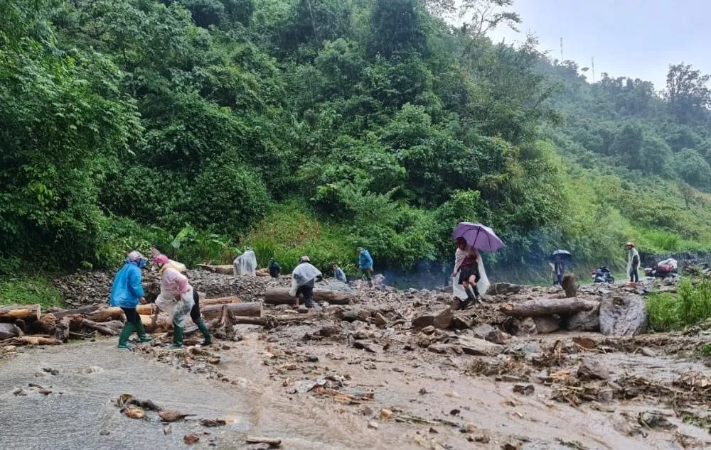 | Tại đoạn Vàng Ngần (Suối Quyền) đi An Lương do mưa to gây tràn đất đá tại huyện Văn Chấn (Yên Bái) |