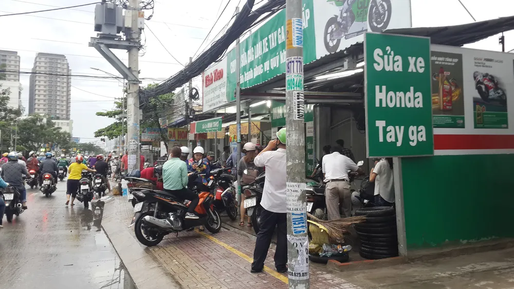 Các tiệm sửa xe gần khu vực Huỳnh Tấn Phát - Nguyễn Thị Thập đều chật kín xe máy chờ sửa. Ảnh: MỸ HẠNH
