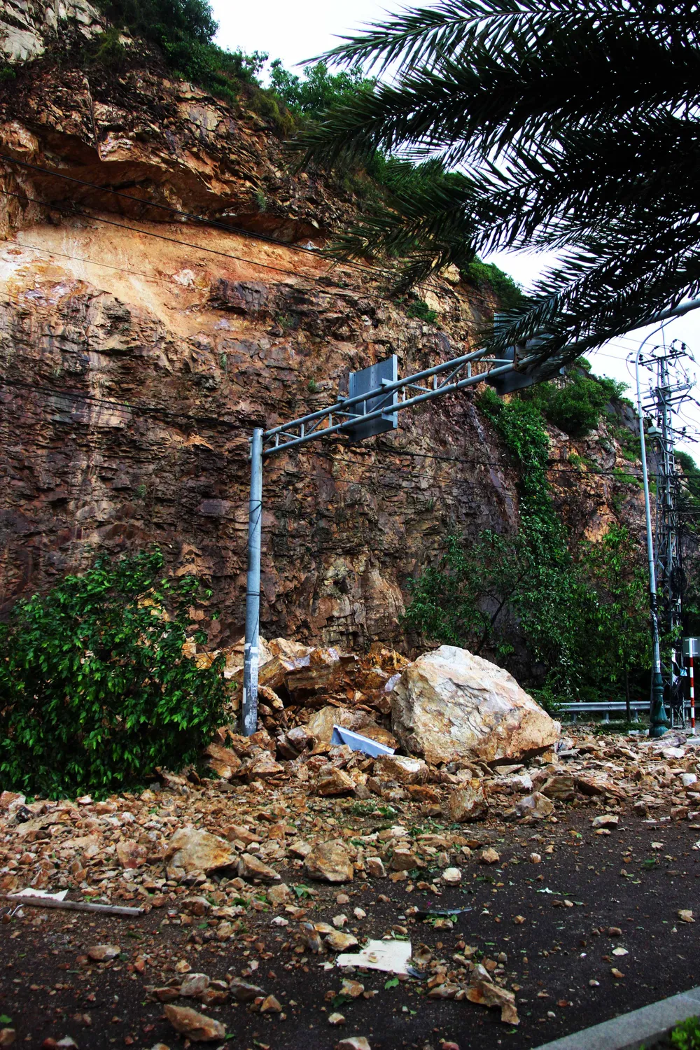Tại trung tâm khu vực sạt lở, khối lượng đất đá rất lớn đổ xuống tràn khắp mặt đường. Nhiều khối đá rất to cũng đổ sập xuống đường, vỡ thành tảng nhỏ sắc cạnh, tràn ra vùng bán kính rộng.