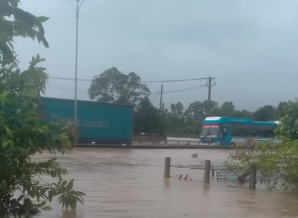 Mưa lớn cộng thêm nước từ thượng nguồn Vườn Quốc gia Bạch Mã đổ về nhanh gây ngập úng trên Quốc lộ 1A đoạn qua xã Lộc Trì, huyện Phú Lộc, tỉnh Thừa Thiên - Huế gây khó khăn cho người và phương tiện tham gia giao thông.