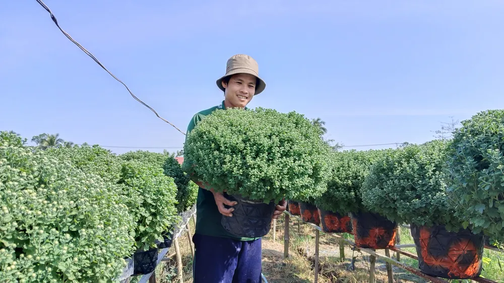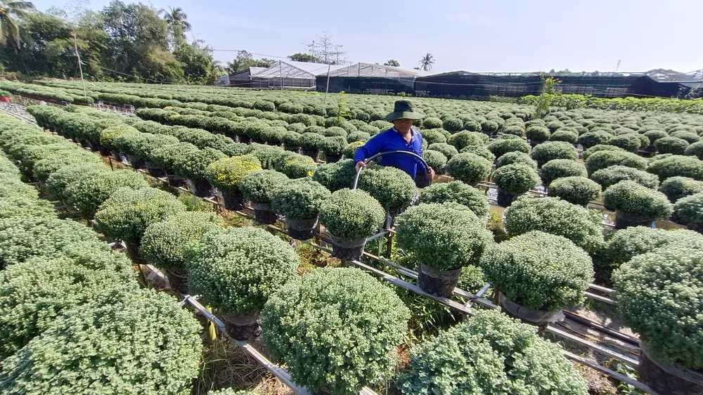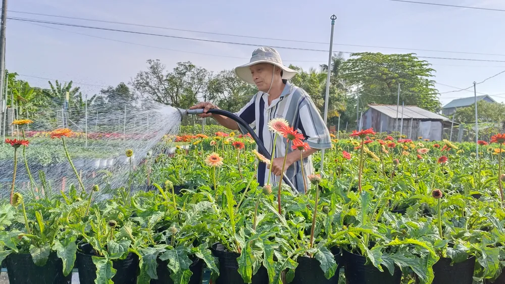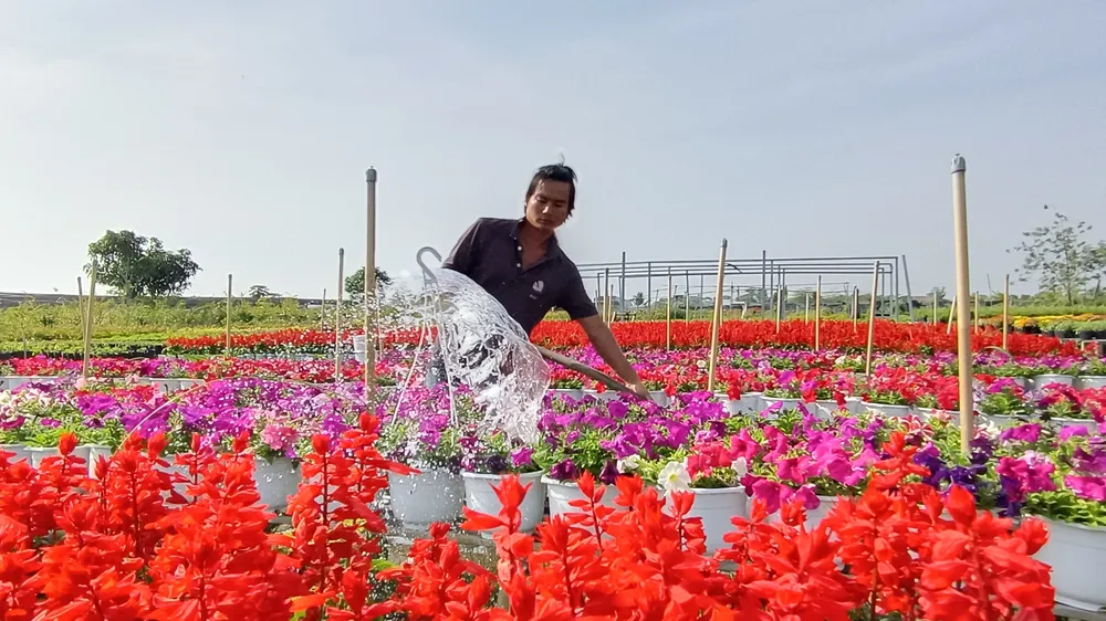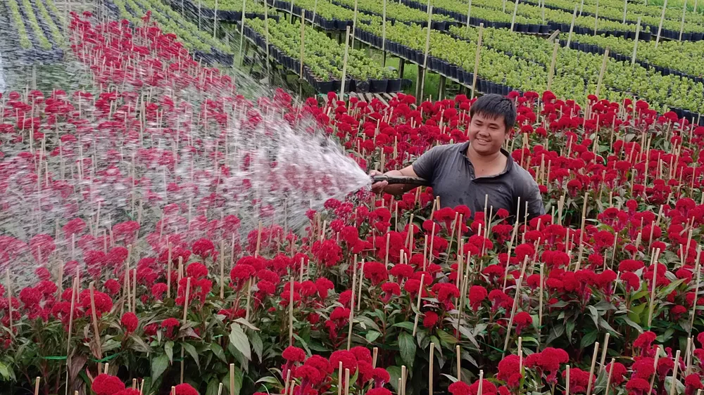 Buổi sáng sớm, nông dân tất bật tưới cây, chăm hoa để cây phát triển tốt, kịp bán vào dịp tết.