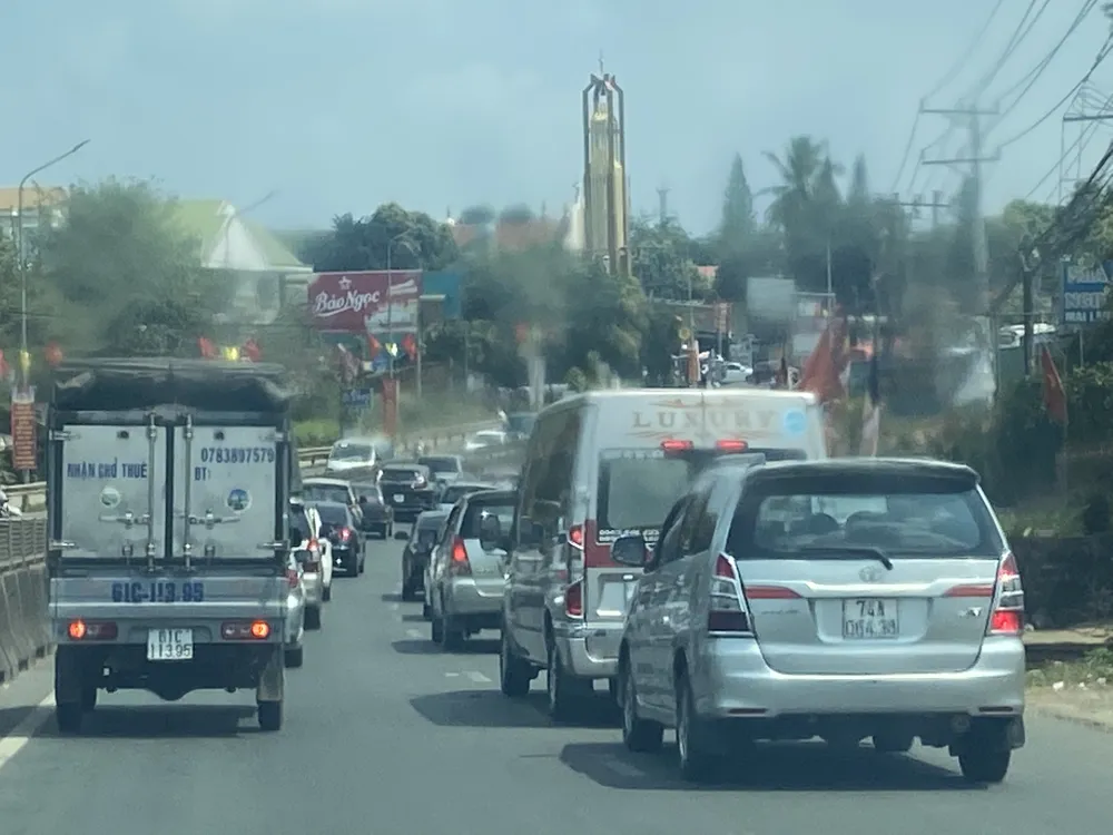 Theo đó, vào 11 giờ trưa cùng ngày, trên quốc lộ 1A, hướng từ TPHCM đi Bình Thuận, hàng trăm chiếc xe du lịch nối đuôi nhau kéo dài từ xã Bàu Hàm 2 đến ngã tư Dầu Giây nhích từng chút một.