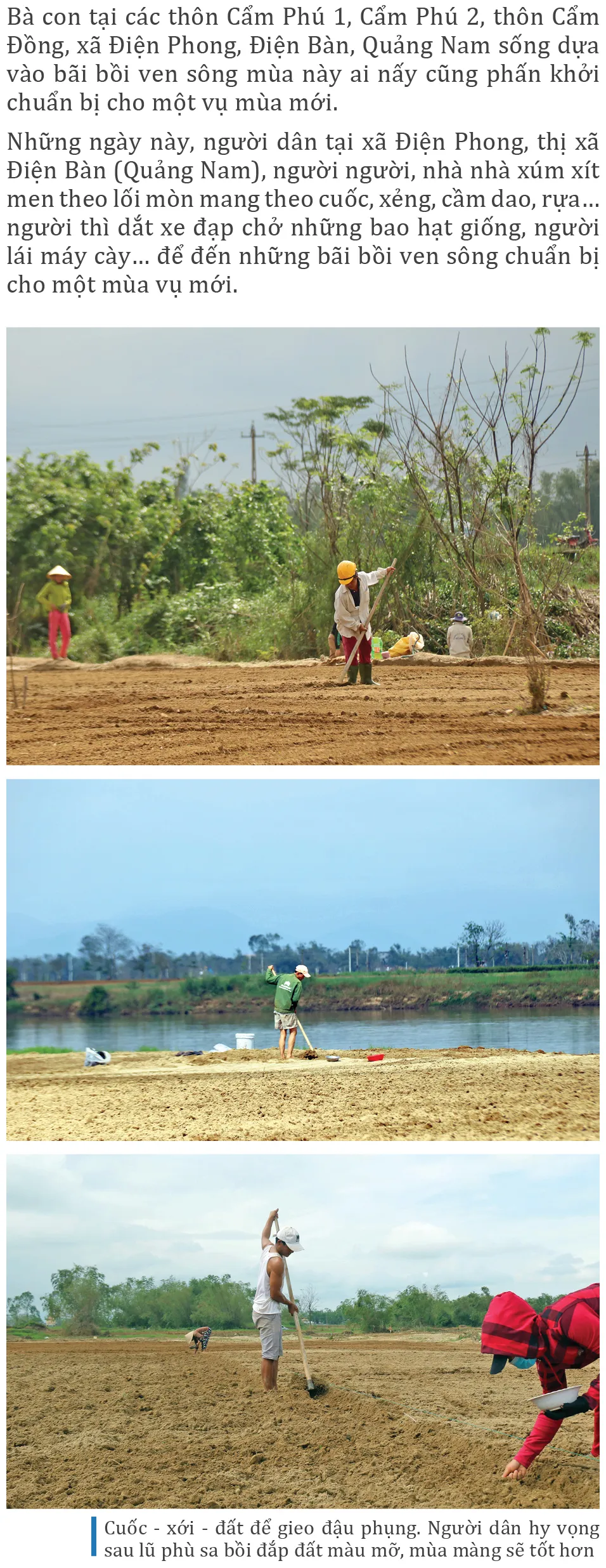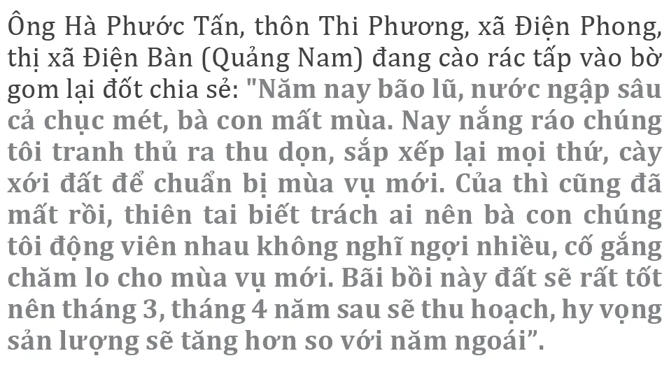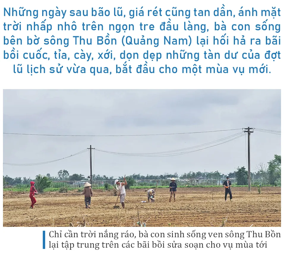 Những ngày sau bão lũ, giá rét cũng tan dần, ánh mặt trời nhấp nhô trên ngọn tre đầu làng, bà con sống bên bờ sông Thu Bồn (Quảng Nam) lại hối hả ra bãi bồi cuốc, tỉa, cày, xới, dọn dẹp những tàn dư của đợt lũ lịch sử vừa qua, bắt đầu cho một mùa vụ mới.