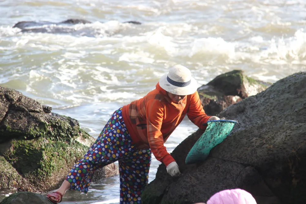 Bà Dương Thị Hoa (65 tuổi, người làng Nam Ô) cho hay, sáng nào bà cũng dậy sớm ra ghềnh để “ngóng” nước biển lên xuống như thế nào. Có hôm đến 6 giờ bà mới bắt đầu, tầm 9 giờ thì hái được khoảng một ký tươi. “Làm nghề này đòi hòi sự chịu khó. Nước rút sớm thì tôi đi sớm, nước rút trễ thì tôi đi trễ”, bà Dương Thị Hoa chia sẻ.
