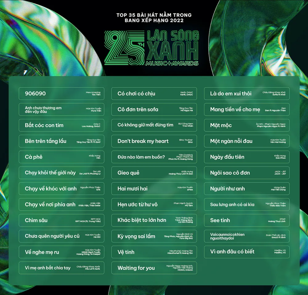 Sau Mỹ Tâm là Hoàng Thùy Linh và Trung Quân với 4 ca khúc nằm trong BXH LSX 2022. Với Hoàng Thùy Linh là các ca khúc Gieo quẻ (ft Đen), Đánh đố (ft Thanh Lam, Tùng Dương), See tình và Việt Nam hết mình (ft Karik).