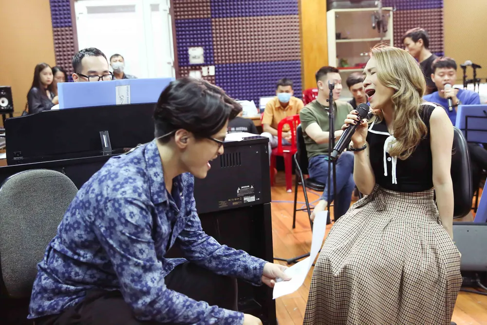 Hà Anh Tuấn và Mỹ Tâm tập luyện cùng ban nhạc