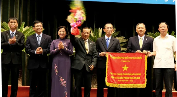 Trưởng Ban Tuyên giáo Thành ủy TPHCM Thân Thị Thư và đại diện Học viện Chính trị Quốc gia Hồ Chí Minh trao Cờ thi đua cấp bộ cho Ban giám đốc Học viện Cán bộ TPHCM