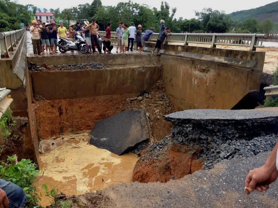 Trong năm 2018, mưa lũ lớn sau bão đã tàn phá nặng nề tại các tỉnh ở Tây Bắc bộ. Trong ảnh: cầu Tân Sơn ở tỉnh Phú Thọ bị sập do lũ cuốn vào tháng 7-2018