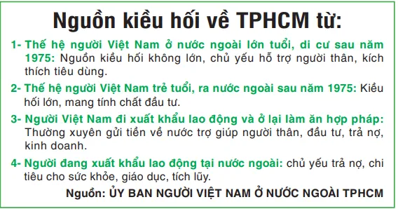 Nghiên cứu của Ủy ban về người Việt Nam ở nước ngoài TPHCM cho thấy, trong thời gian qua, kiều hối chuyển về thành phố từng bước được dịch chuyển nhiều hơn vào thị trường chứng khoán, trái phiếu, mở doanh nghiệp, sản xuất kinh doanh, dịch vụ và bất động sản. Đây là xu hướng tích cực, góp phần trực tiếp vào việc mở rộng đầu tư trong nước, tạo việc làm trong nền kinh tế và tạo nguồn thu cho ngân sách nhà nước từ các hoạt động sản xuất và kinh doanh. Khảo sát trong cộng đồng người Việt Nam ở nước ngoài của đại diện các hội doanh nhân người Việt Nam tại các nước, thế hệ thứ 2 người Việt Nam ở nước ngoài đang có nhu cầu rất lớn được trở về Việt Nam đầu tư. Trong đó đặc biệt là nhu cầu trợ giúp pháp lý xin giấy phép đầu tư, chuyển nguồn tiền, giao thương...