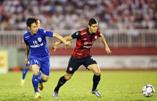 Tấn Tài (trái) tranh chấp bóng với cầu thủ SCG Muangthong United. Ảnh: Dũng Phương.