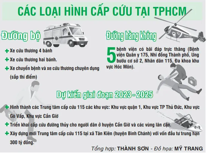 Theo PGS-TS Tăng Chí Thượng, Giám đốc Sở Y tế TPHCM, phát triển mạng lưới cấp cứu ngoài bệnh viện đa dạng hóa từ đường bộ, đường thủy, đường không, theo hướng chuyên nghiệp hiện đại là nhiệm vụ không thể thiếu của ngành y tế TPHCM. Ngành y tế thành phố chủ động đặt ra 5 mục tiêu xây dựng mạng lưới cấp cứu ngoài bệnh viện, bao gồm: hình thành hệ thống các trung tâm cấp cứu 115 và xây dựng cổng tiếp nhận, điều phối cấp cứu 115 theo hướng chuyên nghiệp; tiếp tục nâng cao chất lượng phục vụ cấp cứu ngoài bệnh viện của các trạm cấp cứu vệ tinh, các cơ sở vận chuyển cấp cứu tư nhân; đa dạng hóa các loại hình vận chuyển cấp cứu người bệnh (đường bộ, đường thủy, đường không), đảm bảo nhu cầu và phù hợp đặc điểm địa lý của TPHCM.