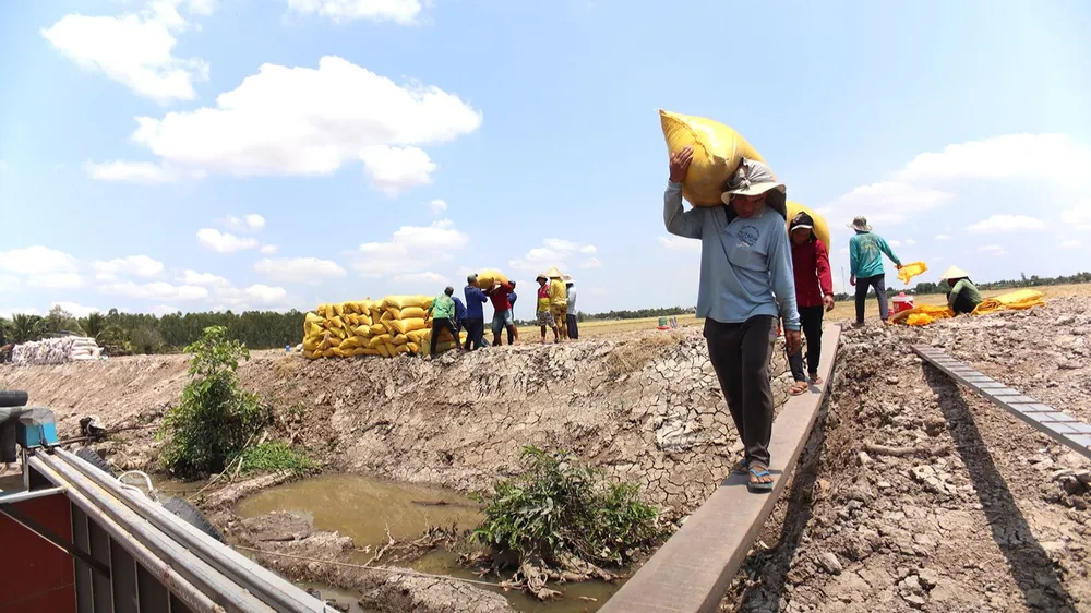 Đội bốc vác lúa chủ yếu là thanh niên, vác từ ruộng lên xe trung chuyển ra bến sông, từ bờ xuống ghe |