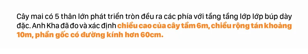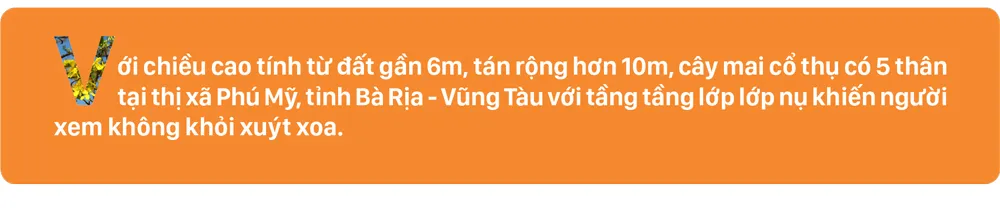Với chiều cao tính từ đất gần 6m, tán rộng hơn 10m, cây mai cổ thụ có 5 thân tại thị xã Phú Mỹ, tỉnh Bà Rịa - Vũng Tàu với tầng tầng lớp lớp nụ khiến người xem không khỏi xuýt xoa.