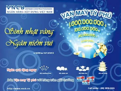 Ngày 21-12-2013, Ngân hàng Xây dựng Việt Nam (VNCB) sẽ tổ chức lễ quay số chương trình “Sinh nhật Vàng - Ngàn niềm vui” diễn ra dưới sự chứng kiến của đông đảo khách hàng tại TPHCM.