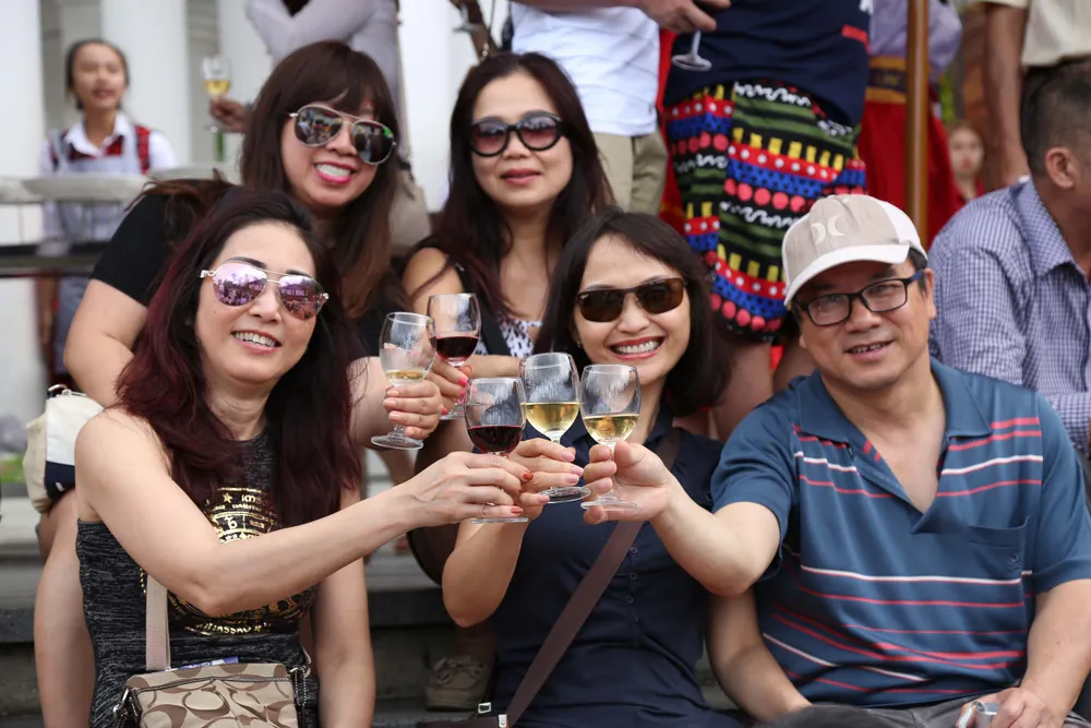 Đón những ly vang miễn phí từ tay nữ tiếp viên xinh đẹp, chẳng cánh mày râu mà cả các bà các cô đều thích thú. Vang trắng, vang đỏ từ những thương hiệu vang nổi tiếng trong và ngoài nước đã tạo nên những hương vị cay nồng đầy cảm xúc cho lễ hội.