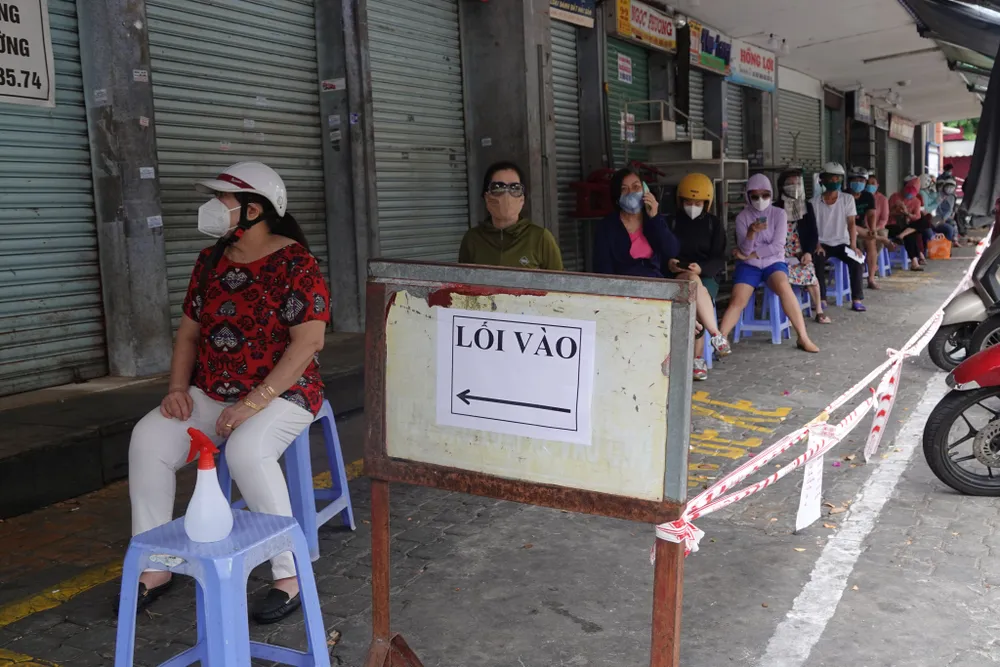 Tại chợ Hàn (phường Hải Châu 1, quận Hải Châu), một số người dân đại diện hộ gia đình thuộc "vùng xanh" cũng bắt đầu đi chợ ngày đầu. Phía bên ngoài cổng vào, Ban quản lý cũng bố trí ghế ngồi để người dân chờ vào chợ. Lực lượng bảo vệ tiến hành quét QR code phiếu đi chợ và gọi người dân vào chợ.