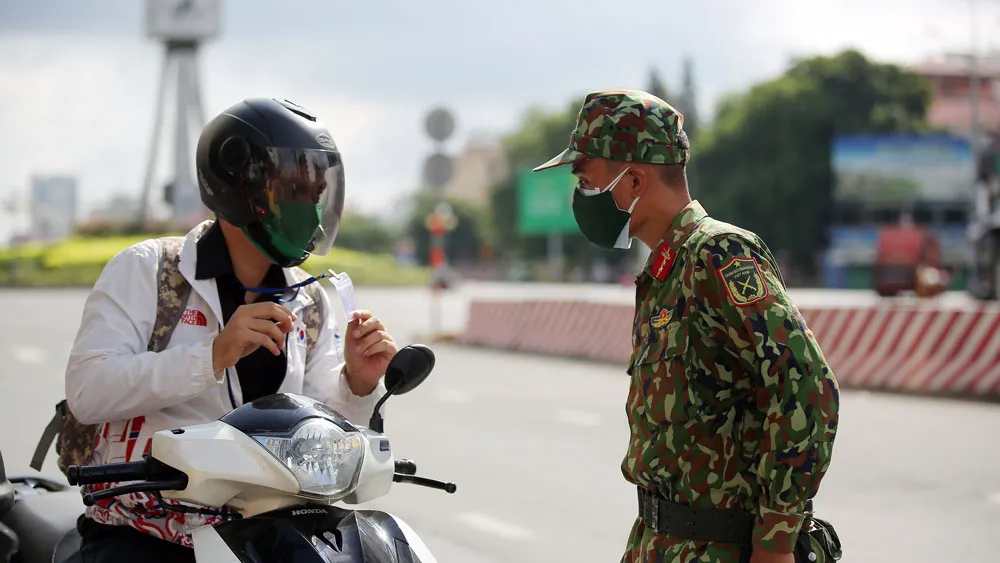 Lực lượng quân đội vào cuộc - xét giấy đi đường trên đường Điện Biên Phủ, phường Đa Kao, quận 1. Ảnh: DŨNG PHƯƠNG