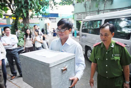 Sáng 5-7, thí sinh (TS) thi đại học (ĐH) đợt 1 trên toàn quốc bước vào thi môn Hóa bằng phương pháp thi trắc nghiệm với thời gian làm bài 90 phút. Đây là môn thi cuối cùng của khối A. Cho đến cuối giờ chiều 4-7, kết thúc ngày thi đầu tiên của đợt 1, Thứ trưởng Bộ GD-ĐT Phạm Vũ Luận khẳng định: đề thi Toán và Lý đảm bảo an toàn, bí mật tuyệt đối.