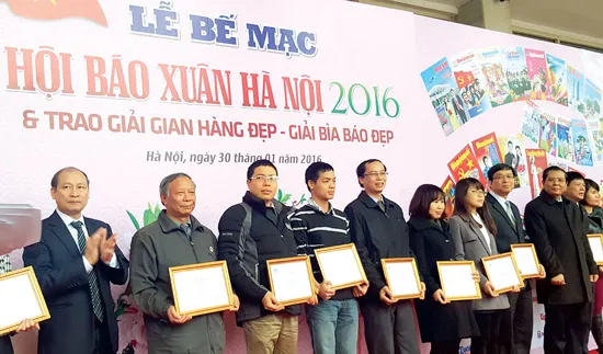 Trao giải bài báo hay viết về Hà Nội trên báo xuân Bính Thân 2016. Tác giả Mai An - Báo SGGP, đoạt giải với tác phẩm Hoàng thành Thăng Long - Tiếng vọng ngàn năm. Ảnh: Khắc Hào