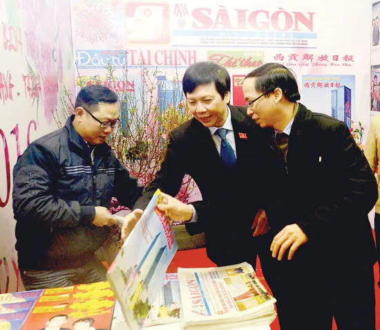 Phó Chủ tịch Hội Nhà báo Việt Nam Hồ Quang Lợi (giữa) thăm gian trưng bày của Báo SGGP