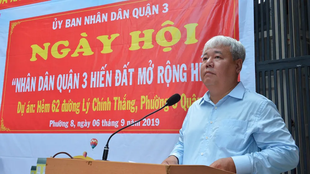 Chủ tịch UBND quận 3 Võ Khắc Thái phát biểu trong ngày hội "Nhân dân quận 3 hiến đất mở rộng hẻm. Ảnh: VIỆT DŨNG
