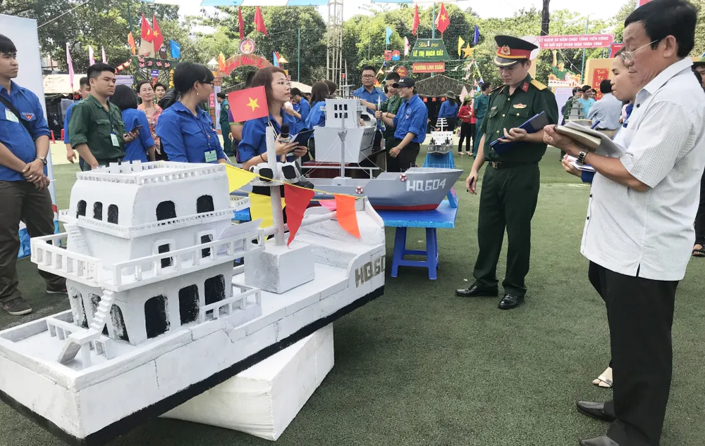 Bạn Huỳnh Quang Thụy (phường Hiệp Bình Phước) là đảng viên trẻ tình nguyên đăng ký nhập ngũ đang thuyết trình mô hình tàu Hải quân của trại mình. Ảnh: KIỀU PHONG
