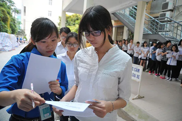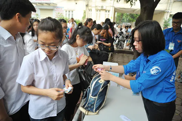 Sinh viên tình nguyện giúp các thí sinh tra cứu số báo danh và kiểm tra đồ dùng trước khi vào thi. Các thí sinh chỉ mang vào giấy báo thi, số báo danh và CMTND