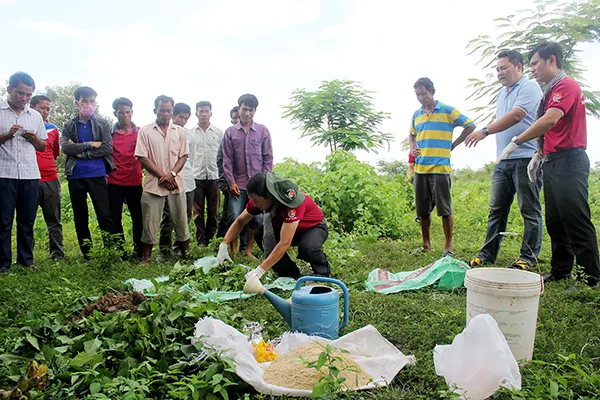 Các chuyên viên - kỹ sư nông nghiệp tập huấn nông nghiệp, sản xuất phân hữu cơ vi sinh cho người dân tại huyện Saysetha