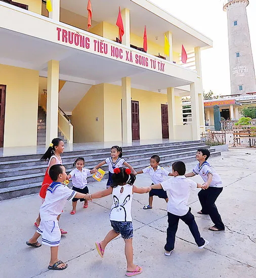 Các em thiếu nhi vui chơi trước Trường Tiểu học xã Song Tử Tây vừa được khánh thành do cán bộ, giáo viên, công nhân viên, học sinh ngành giáo dục - đào tạo TPHCM tặng.