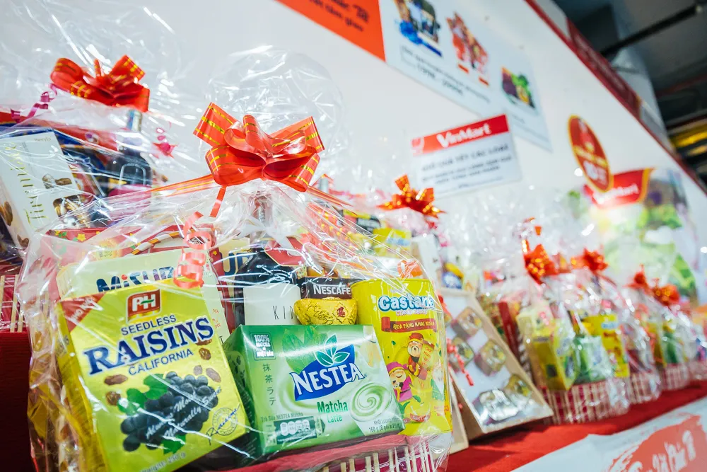 VinMart cũng đã bắt đầu trưng bày các loại giỏ quà, hàng hóa Tết đầy màu sắc, hương vị với giá chỉ từ 199.000 VNĐ. Những quầy hàng ảm đạm bỗng trở nên nổi bật, đầy sắc xuân hơn bao giờ hết.