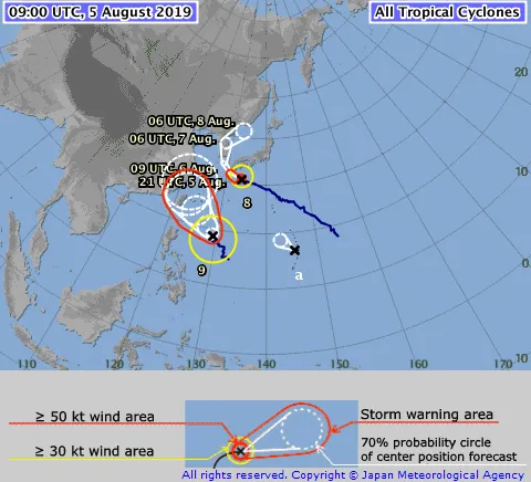 Ở bên ngoài Thái Bình Dương, đang đồng thời tồn tại 2 cơn bão và 1 vùng áp thấp nhiệt đới vừa mới manh nha hình thành. Trong đó, cơn bão Francisco đang đổ bộ vào Nhật Bản. Còn cơn siêu bão được đặt theo tên Việt Nam là Lekima đang hướng thẳng về phía đảo Đài Loan – Trung Quốc.