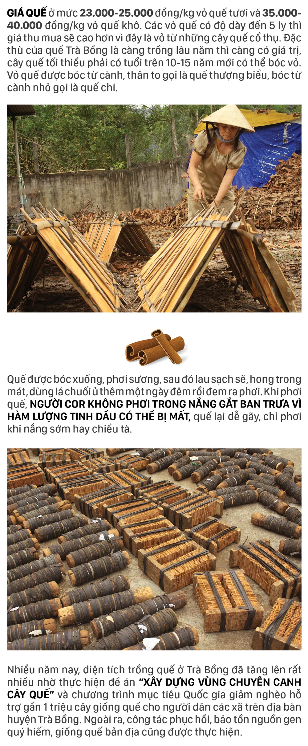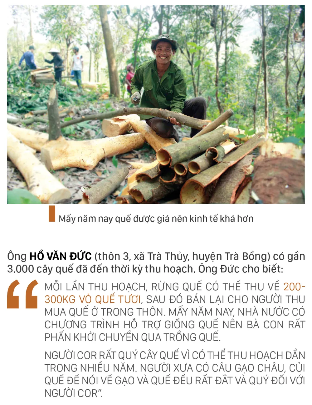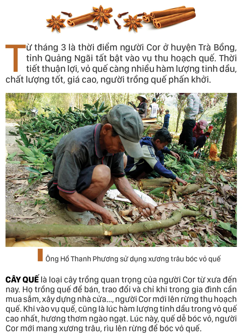 Từ tháng 3 là thời điểm người Cor ở huyện Trà Bồng, tỉnh Quảng Ngãi tất bật vào vụ thu hoạch quế. Thời tiết thuận lợi, vỏ quế càng nhiều hàm lượng tinh dầu, chất lượng tốt, giá cao, người trồng quế phấn khởi.