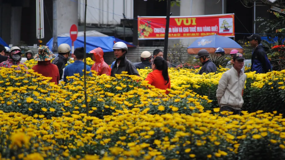 Cứ Tết đến Xuân về, Phu Văn Lâu và Nhà hát lớn là hai địa điểm chợ hoa Tết lớn nhất thành phố Huế. Dù thời tiết xấu sáng 12-2, rất đông người dân Cố Đô đội mưa đổ về Nhà hát lớn để sắm những chậu hoa đem về nhà trang trí Tết.