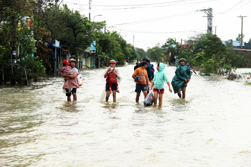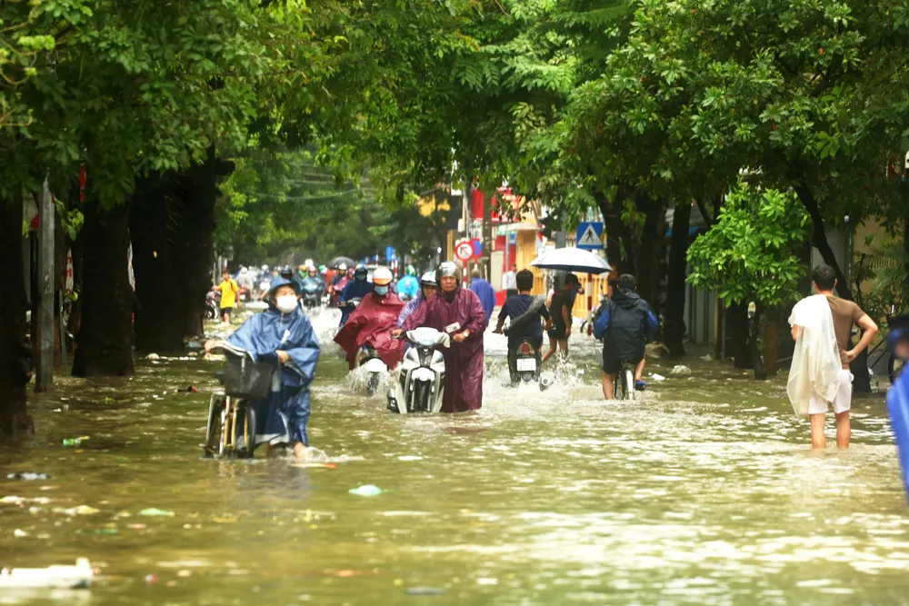 Người dân cố đô Huế bì bõm lội qua điểm đường bị ngập hàng trăm mét