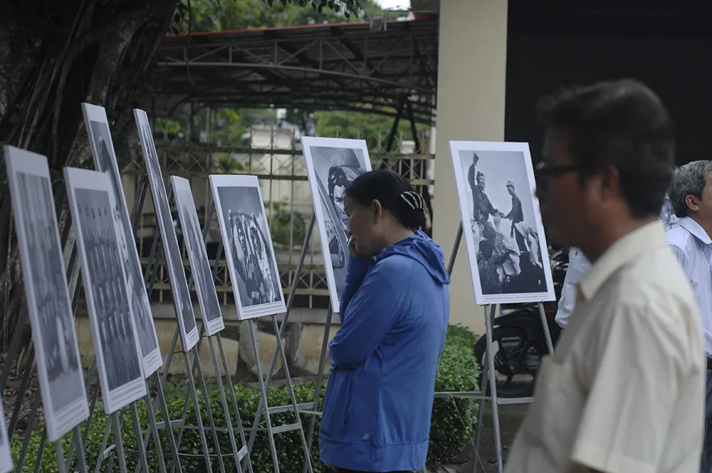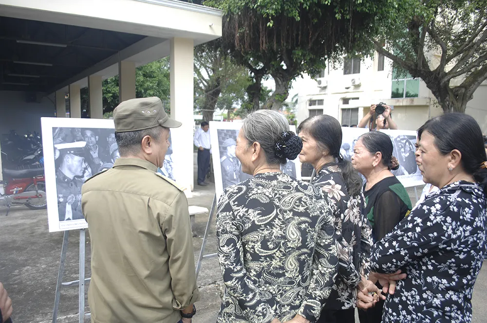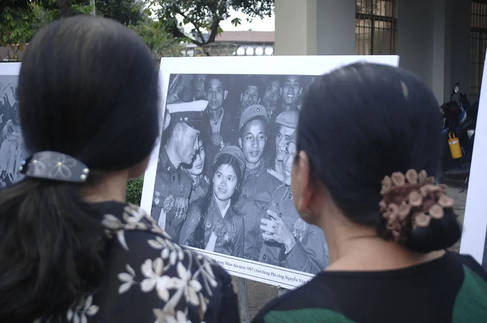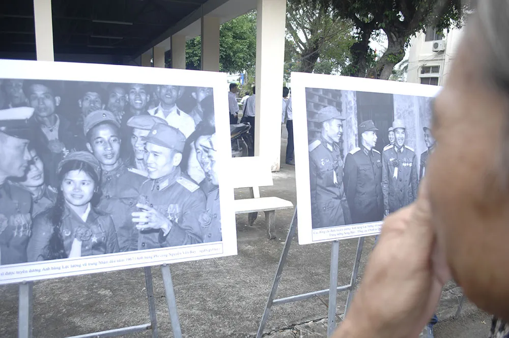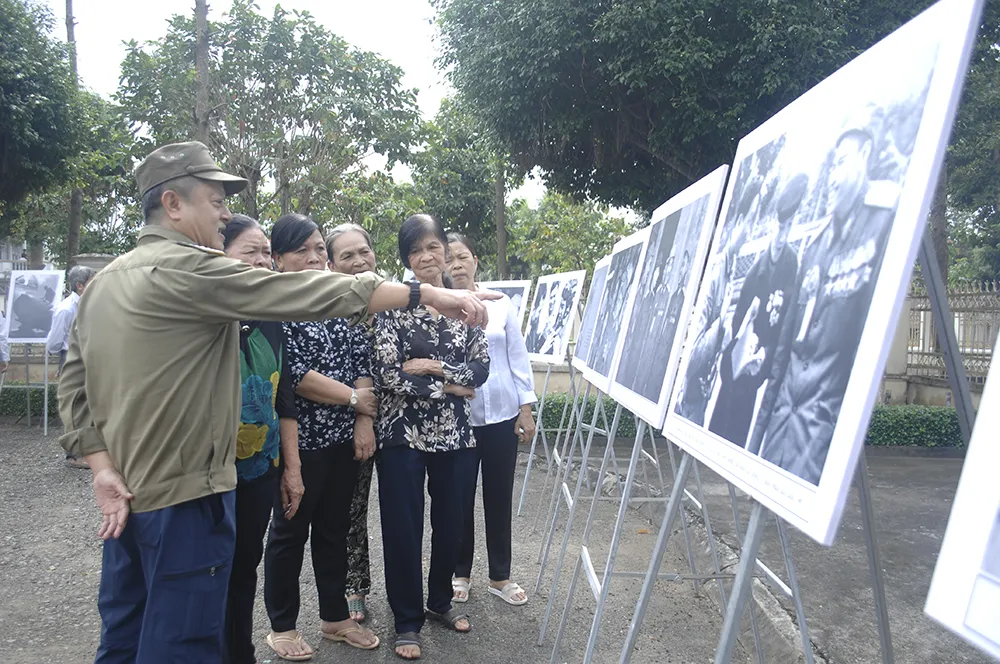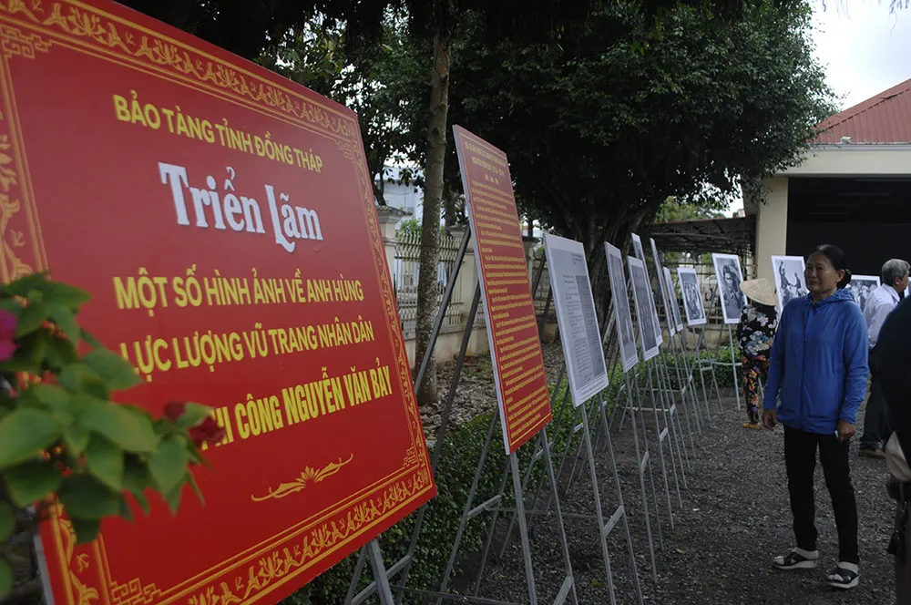 Bên ngoài hội trường, Bảo tàng tỉnh Đồng Tháp triển lãm nhiều ảnh về những chiến công, thành tích của ông Bảy lúc sinh thời