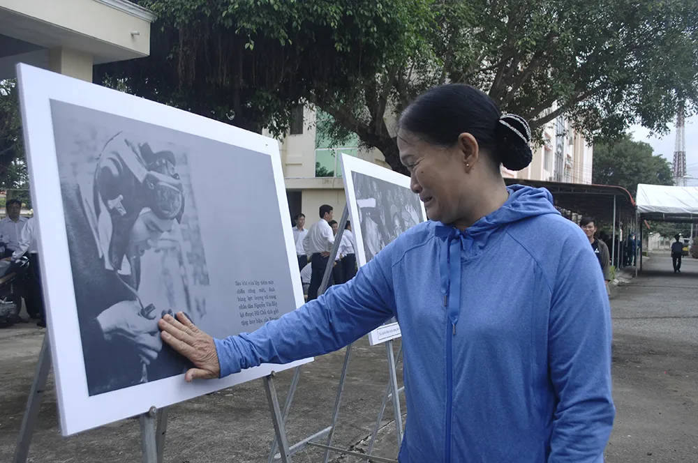 Bà Trần Thị Niên, vợ của Anh hùng lực lượng vũ trang nhân dân Nguyễn Văn Bảy nén đau thương nhìn di ảnh của chồng