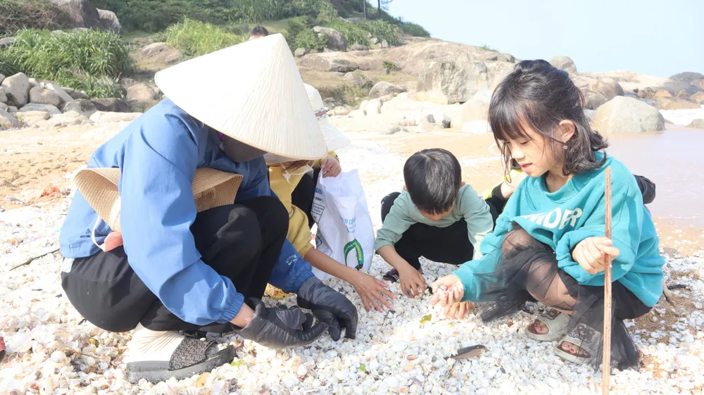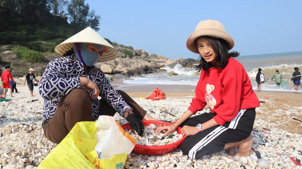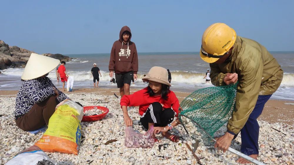 Người dân ra bờ biển xã Kỳ Phú (Kỳ Anh, Hà Tĩnh) vớt "lộc biển" đầu năm |