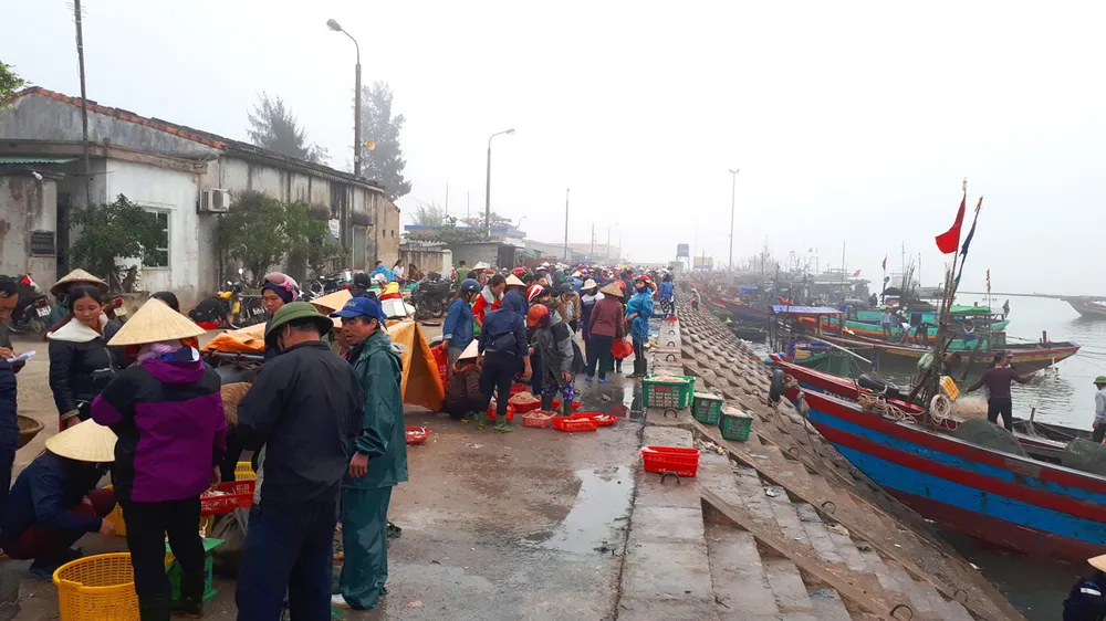 Cảnh mua bán hải sản tấp nập tại cảng cá Cửa Sót, xã Thạch Kim, huyện Lộc Hà, tỉnh Hà Tĩnh ngày giáp Tết Nguyên đán
